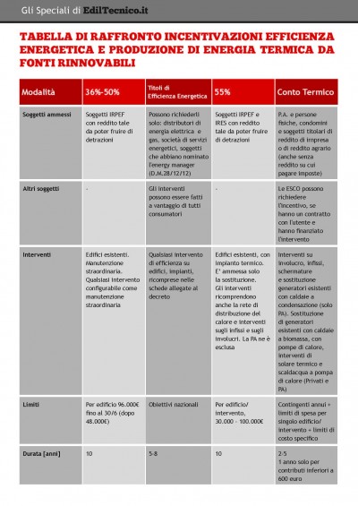 Gli incentivi previsti dal Conto Termico non sono cumulabili con le detrazioni previste dalla legge n. 296/2006 e s.m.i. (la c.d. Detrazione 55%) e dal d.P.R. 917/1986 e s.m.i. (il cosiddetto 36% ora Detrazione 50%) né con i titoli di efficienza energetica. Ci si pone quindi il problema di quale strumento utilizzare al fine di poter al meglio sfruttare gli incentivi pubblici esistenti. Qui sotto una tabella riassuntiva delle differenze tra le varie forme di incentivazione e bonus fiscali che è possibile scegliere (scarica qui la tabella in formato PDF).